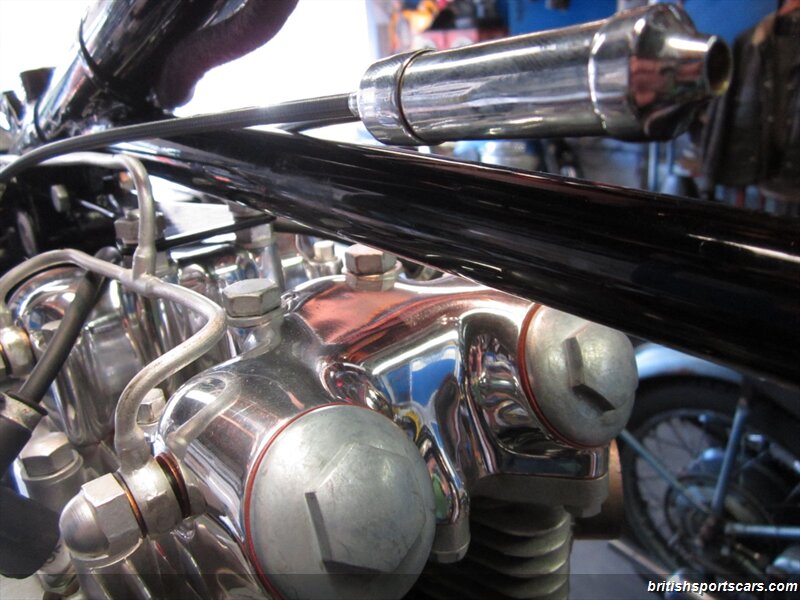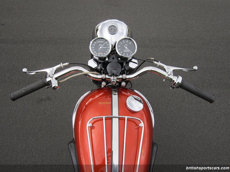 Original chrome parts were stripped and re-plated, with the original Dunlop stampings on the wheel rims nicely preserved in the process. Alloy parts were polished, and original nuts and bolts were Cadium plated, providing for a the correct assortment of finishes throughout. The original Lucas horn and rectifiers were retained, and a new old stock wiring harness sourced. The original 376 Amal carburetors were fully refurbished, and the original fuel taps stripped for Nickel and Chrome plating. No part of the motorcycle was left untouched during the restoration, utilizing either original restored, or new-old-stock replacements, including key visual components such as the wonderful original seat cover.